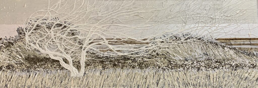 Su tela, con albero in rilievo materico e foglia argento – misura 120 x 40