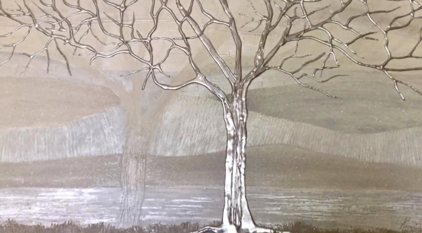 Installazione ” Il Figlio della Bora” su 4 sezioni di tronchi( abbattuti in città) con albero bianco in rilievo materico e foglia argento – misura 1800 x 1300