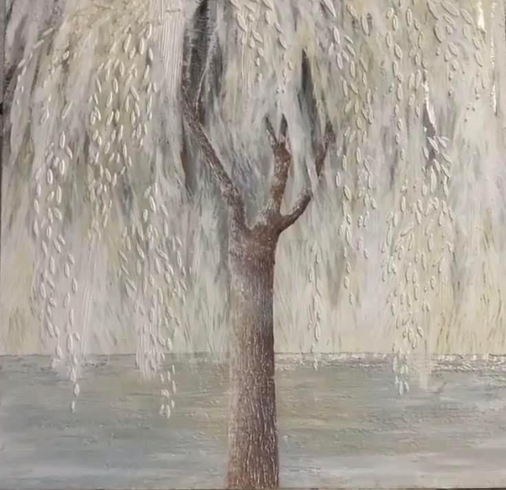Su tela, con albero in rilievo materico e foglia argento- misura 90 x 60